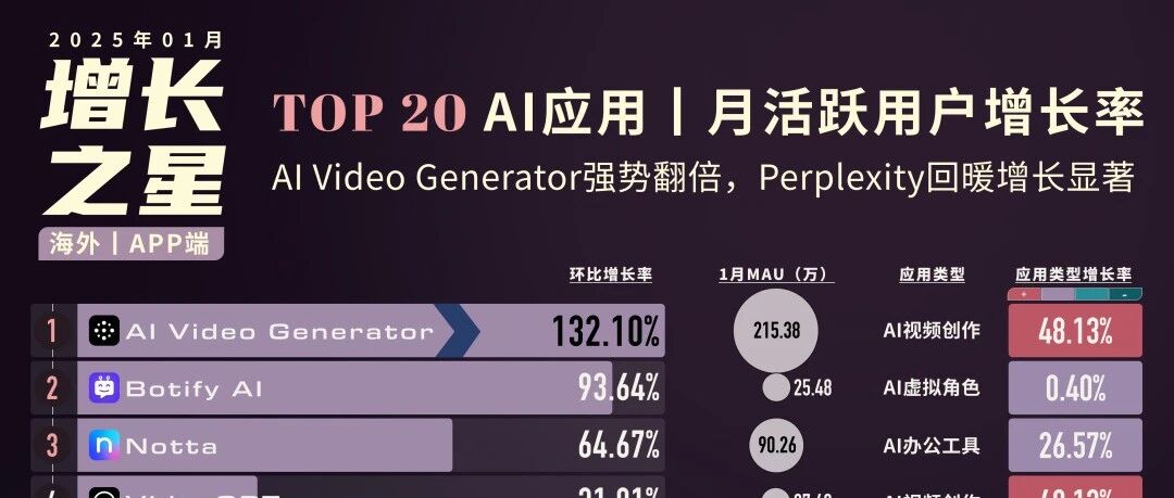 海外AI应用行业全景丨2025年1月丨TOP 赛道 + TOP 50 AI应用 + 增长之星丨Xsignal