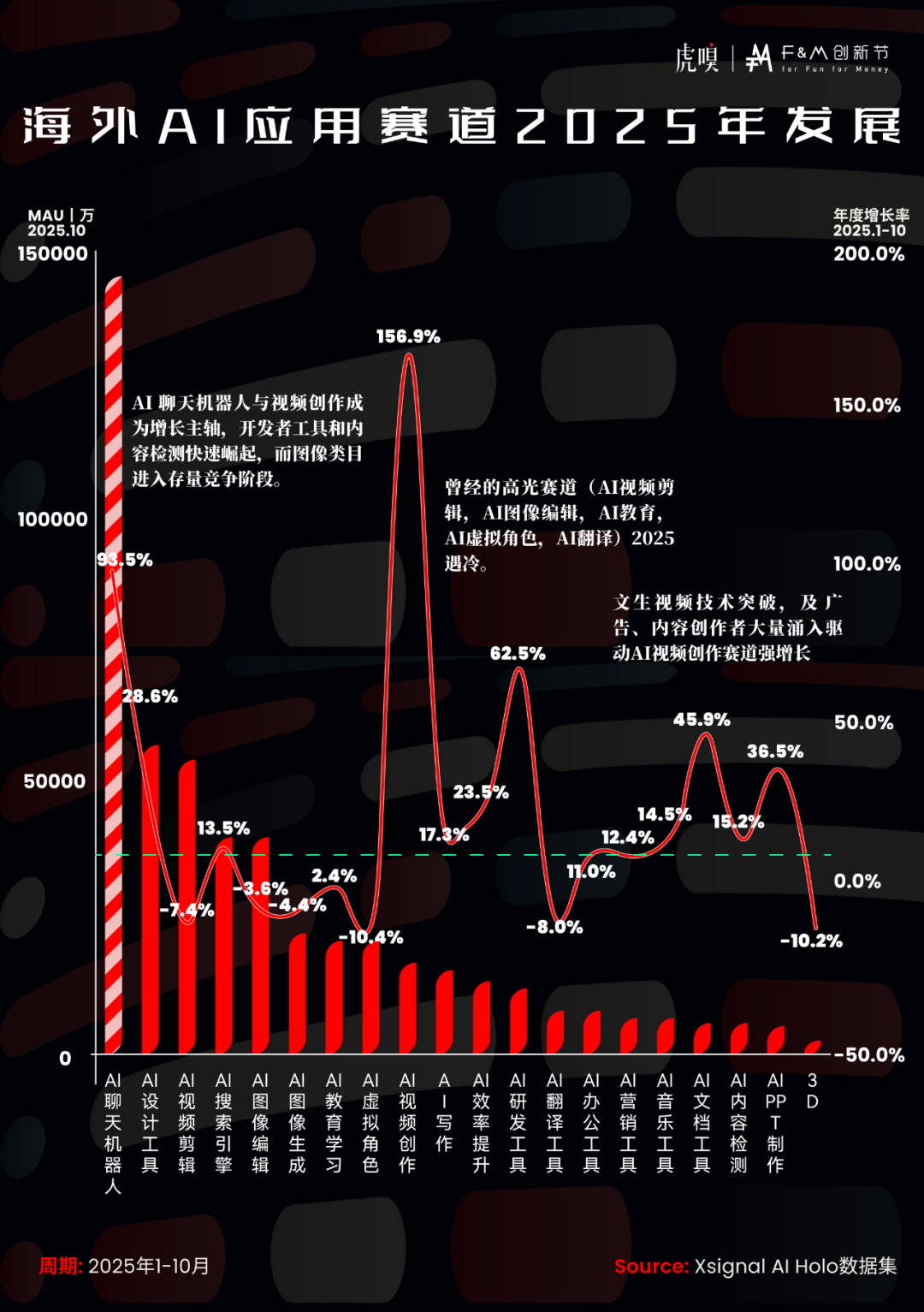 2025年增长主轴为AI聊天机器人与视频创作,文生视频技术突破驱动了强增长。