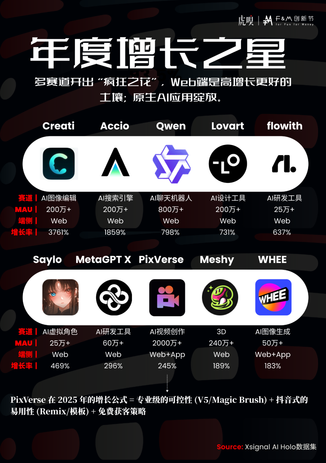 作为年度增长之星,PixVerse(增长245.10%)为行业提供了教科书式的增长范本。其2025年的增长公式为:
