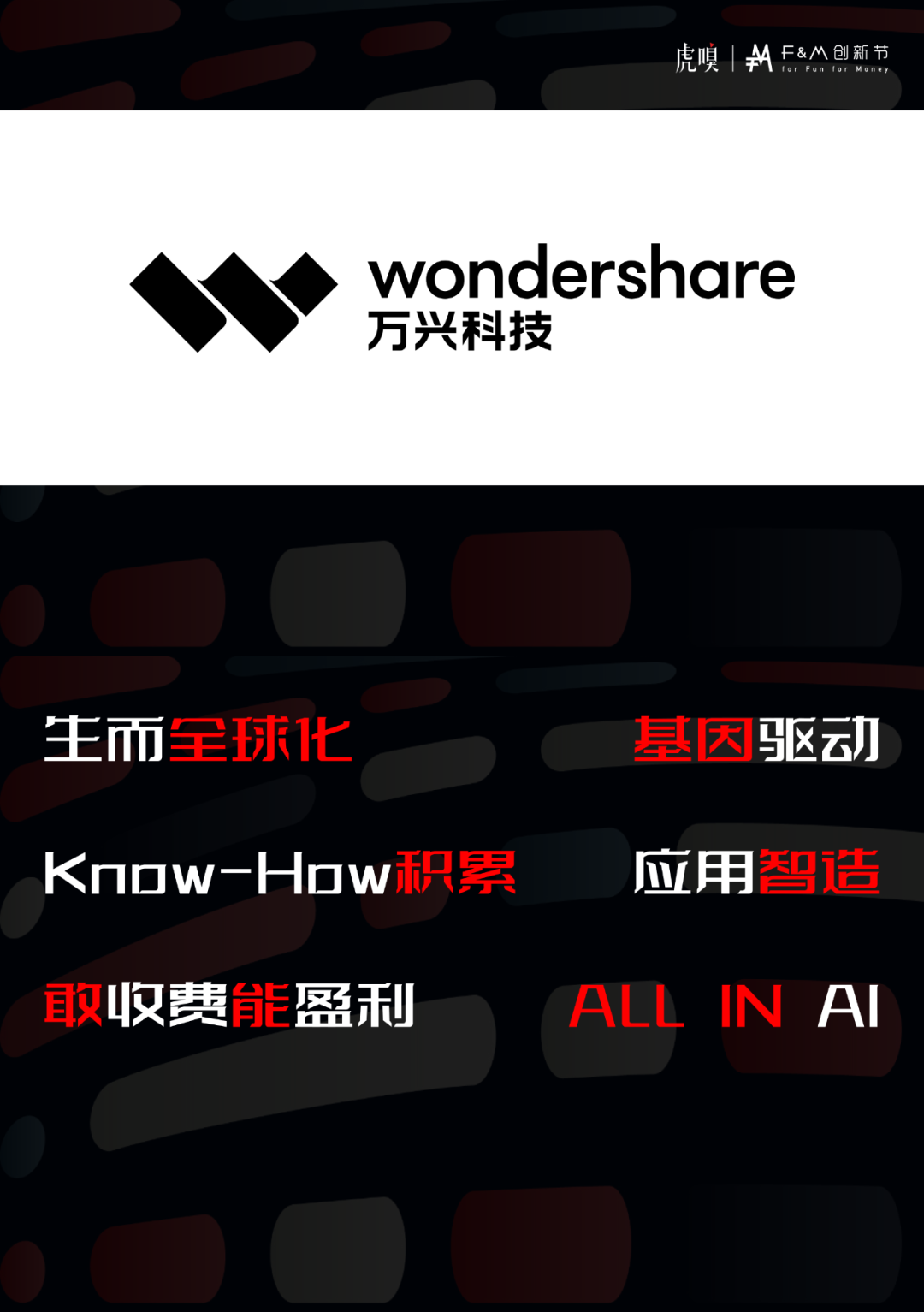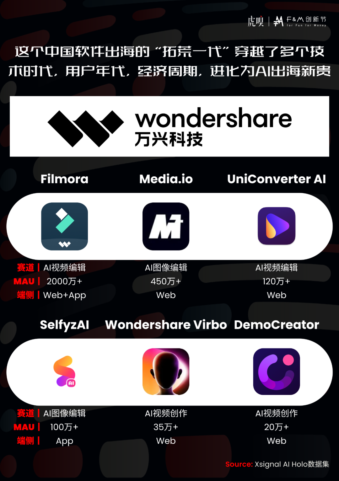 - 旗舰产品: Filmora(AI视频编辑,拥有2000万+月活,Web+App双端)。
