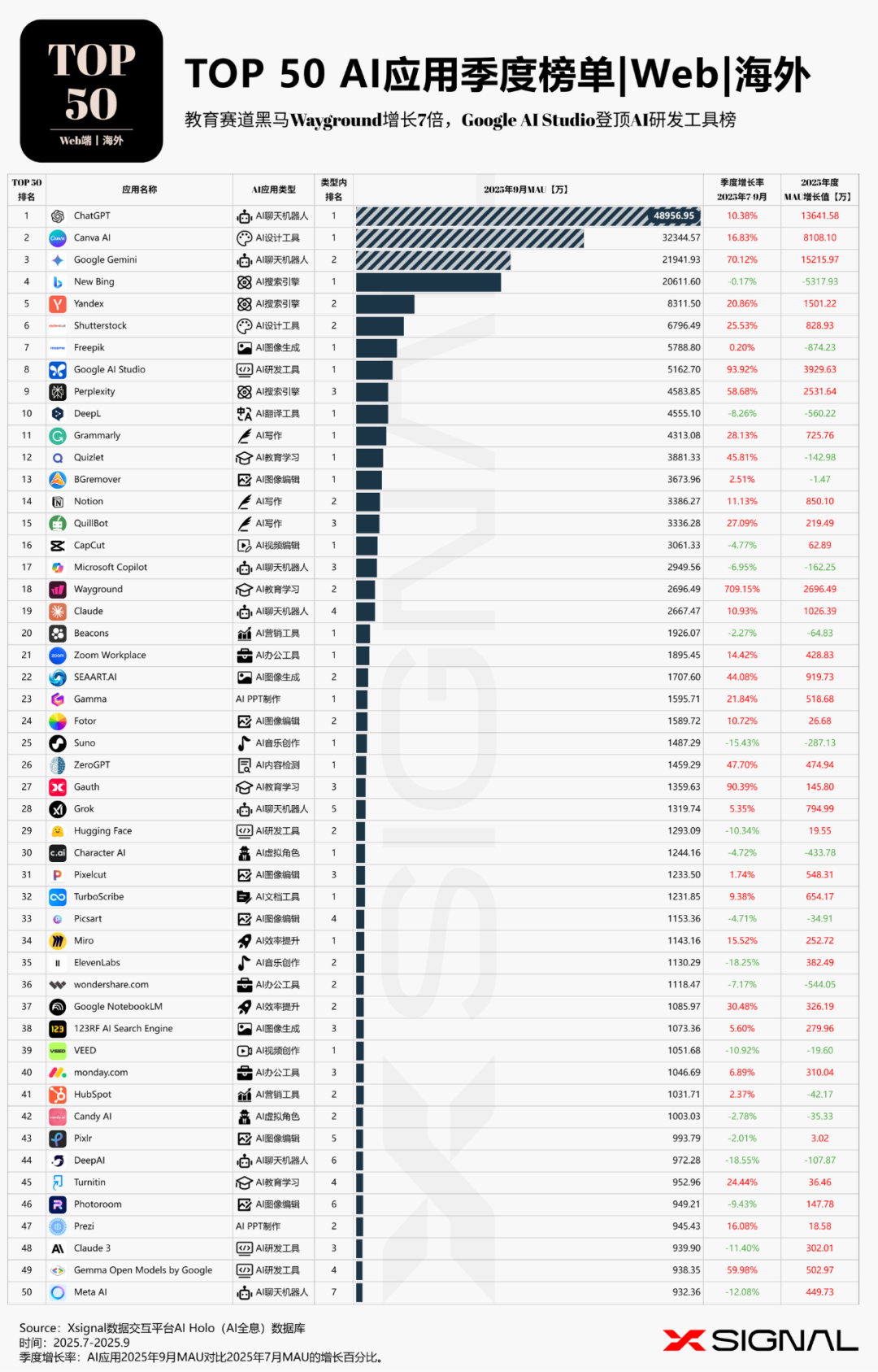 Z·Oct 30, 2025·15 min read海外AI应用行业全景丨万字长文丨2025年9月丨赛道格局 + 赛道之王 + TOP 50 AI应用 + 增长之星丨Xsignal