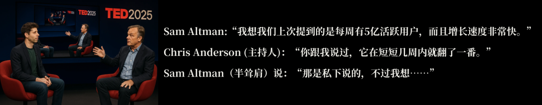DeepSeek风暴在2025年1月和2月席卷全球,进一步推动了AI应用行业的普及,极大地扩大了AI应用的用户的整体规模,在此浪潮下,ChatGPT也乘风扬帆。Sam Altman 在2025年4月1日的TED访谈中有着如下的对话: