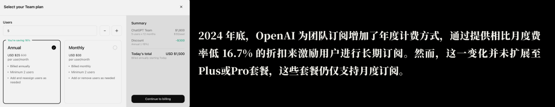 此外,OpenAI对团队订阅收费模式进行了差异化设计,推出了年度付费模式,使整体费用降低了16.7%。